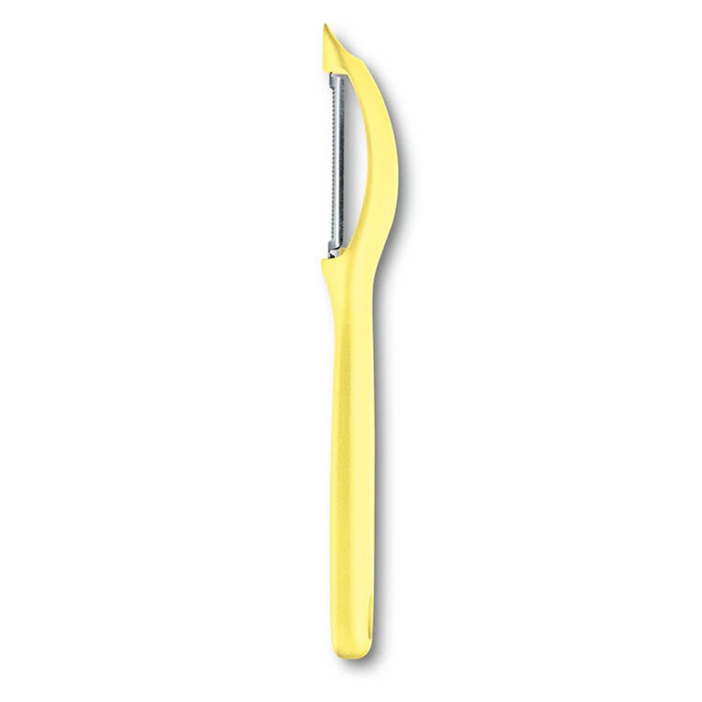 Овощечистка с двусторонней режущей кромкой для овощей и фруктов Victorinox (7.6075.82). Мелкие зубчики надрезают шкурку безо всякого усилия, а небольшая волнистость не позволяет лезвию излишне заглубляться.