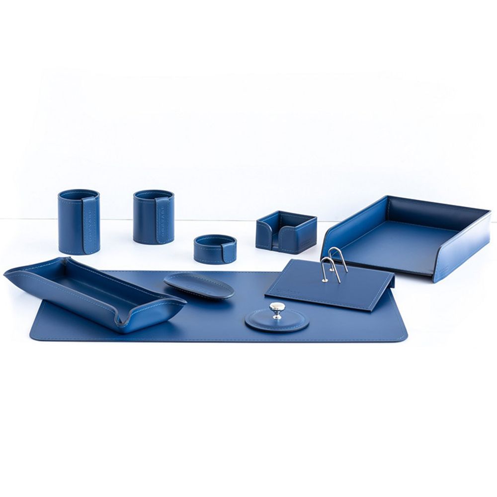 Настольный набор — практичный подарок для организации рабочего пространства. Наборы серии Бизнес — это оптимальное соотношение цены и качества. Кожа Cuoietto, из которой изготовлены данные наборы, отличается высокой прочностью благодаря полиуретановому покрытию. Разнообразие цветовых решений позволяет подобрать набор для руководителя, который впишется в интерьер любого стиля и с уверенностью принимать самых изысканных клиентов. Этот набор выполнен из кожи в цвете благородного синего сапфира и будет отлично смотреться, например, с предметами интерьера из дерева светлого или медового оттенков. А его сочетание с белыми тонами, предаст интерьеру прохладу и свежесть.