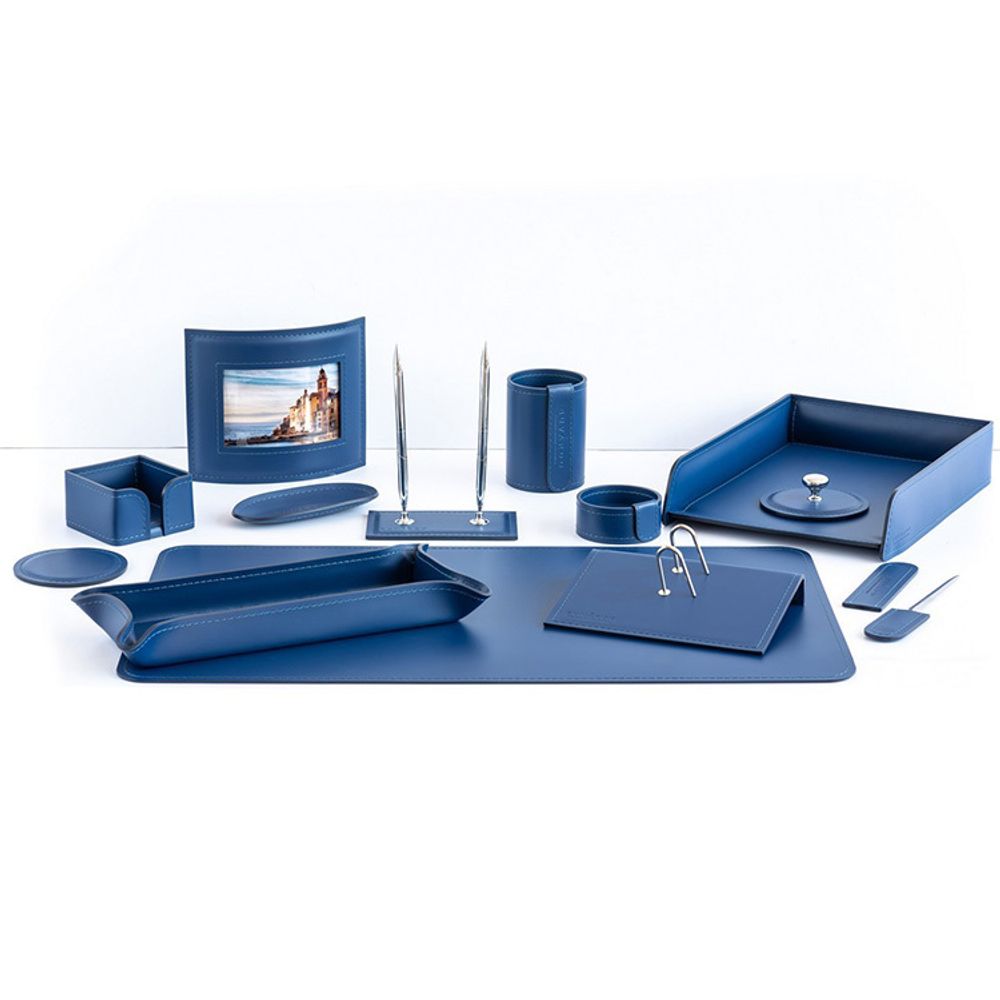 Настольный набор — практичный подарок для организации рабочего пространства. Наборы серии Бизнес — это оптимальное соотношение цены и качества. Кожа Cuoietto, из которой изготовлены данные наборы, отличается высокой прочностью благодаря полиуретановому покрытию. Разнообразие цветовых решений позволяет подобрать набор для руководителя, который впишется в интерьер любого стиля и с уверенностью принимать самых изысканных клиентов. Этот набор выполнен из кожи в цвете благородного синего сапфира и будет отлично смотреться, например, с предметами интерьера из дерева светлого или медового оттенков. А его сочетание с белыми тонами, предаст интерьеру прохладу и свежесть.