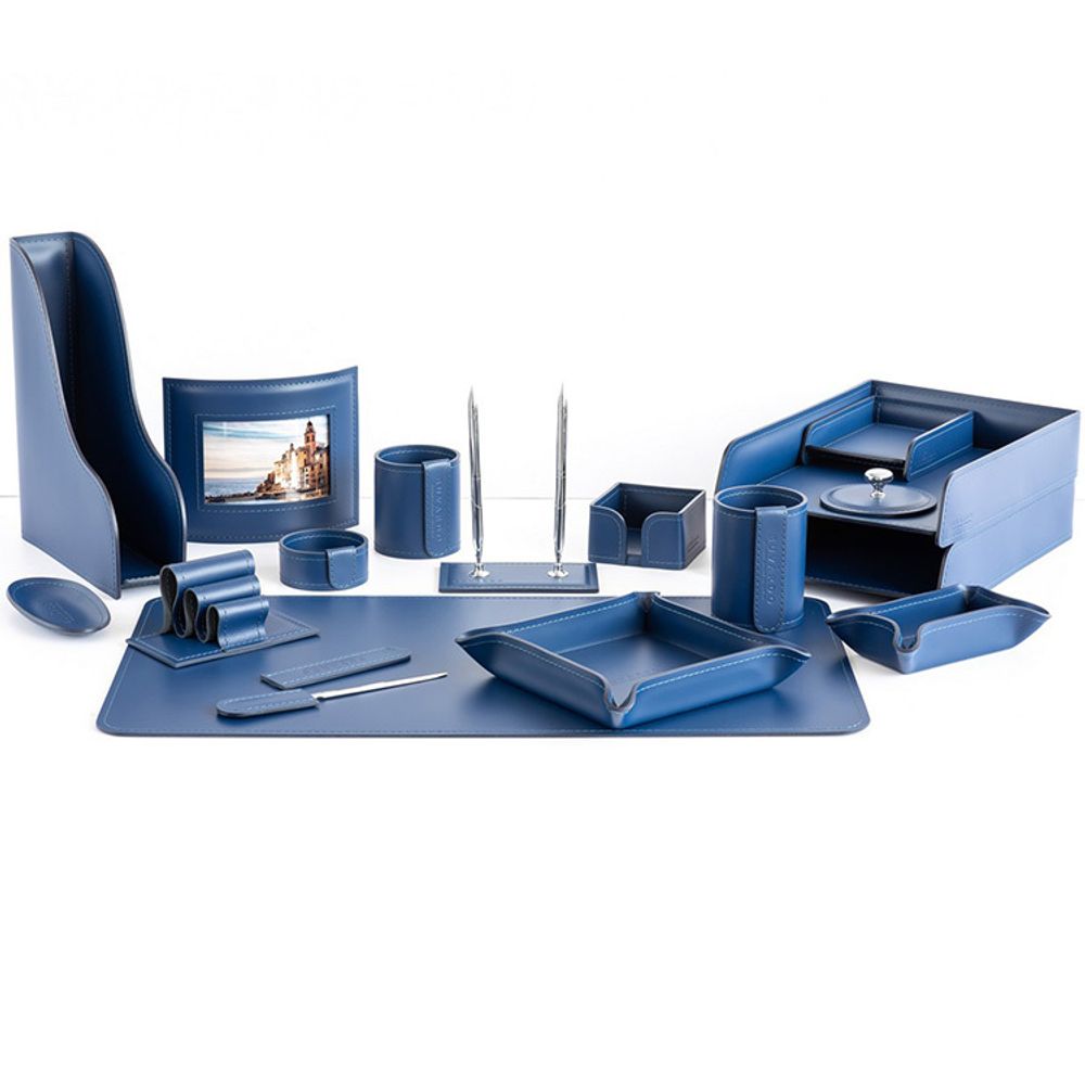 Настольный набор — практичный подарок для организации рабочего пространства. Наборы серии Бизнес — это оптимальное соотношение цены и качества. Кожа Cuoietto, из которой изготовлены данные наборы, отличается высокой прочностью благодаря полиуретановому покрытию. Разнообразие цветовых решений позволяет подобрать набор для руководителя, который впишется в интерьер любого стиля и с уверенностью принимать самых изысканных клиентов. Этот набор выполнен из кожи в цвете благородного синего сапфира и будет отлично смотреться, например, с предметами интерьера из дерева светлого или медового оттенков. А его сочетание с белыми тонами, предаст интерьеру прохладу и свежесть.