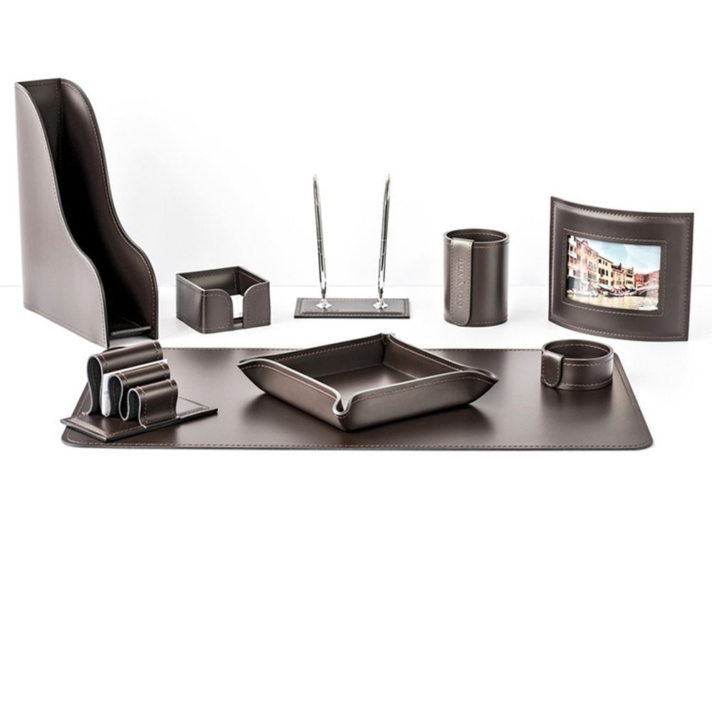 Настольный набор — практичный подарок для организации рабочего пространства. Наборы серии Бизнес — это оптимальное соотношение цены и качества. Кожа Cuoietto, из которой изготовлены данные наборы, отличается высокой прочностью, благодаря полиуретановому покрытию. Разнообразие цветовых решений позволяет подобрать набор для руководителя, который гармонично вольется в интерьер любого стиля, а также с уверенностью принимать самых изысканных клиентов.