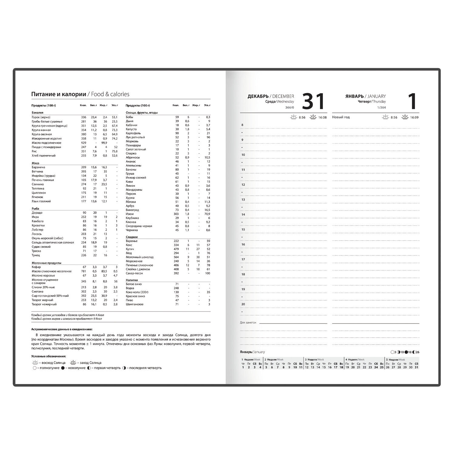 Внутренний блок включает 160 листов белой бумаги плотностью 60 г/м2. Благодаря стандартному формату А5 (145х215 мм) ежедневник удобно использовать как в офисе, так и на выездных деловых встречах. Твердая обложка покрыта глянцевой пленкой. Печать внутреннего блока – в одну краску.