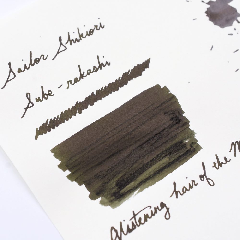 Чернила Sailor Shikiori Fairy Tales Suberakashi — это глубокий, почти черный темно-зеленый оттенок из коллекции «Японские сказки». Цвет вдохновлен образом принцессы Кагуи и блеском ее черных волос в лунном свете осенней ночи.