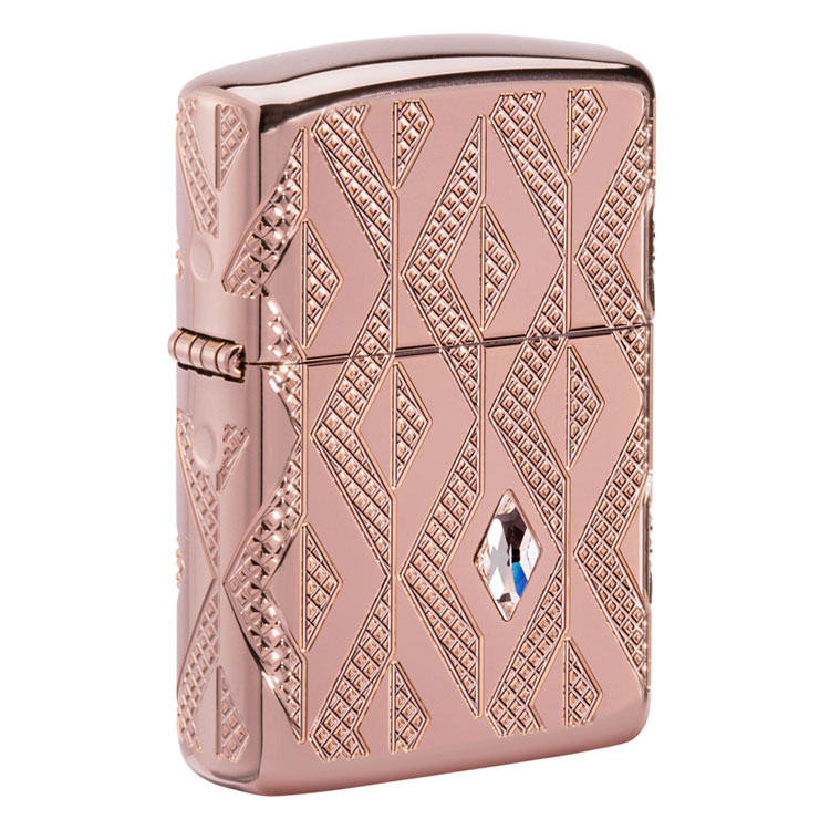 Зажигалка Zippo Armor с корпусом в 1,5 раза толще стандартных корпусов Zippo. Рисунок Geometric Diamond Design выполнен по технологии глубокой многогранной гравировки. На позолоченной розовым золотом поверхности размещен кристалл в форме бриллианта прикрепленный к передней части.