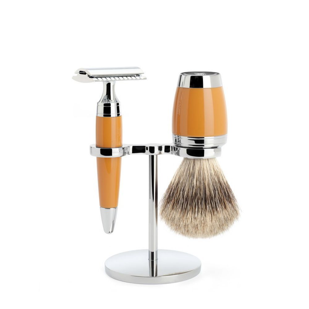 - Бритвенный набор MUEHLE STYLO, смола, цвет карамели, барсучий ворс категории Fine, Т-образная бритва (S 281 K 74 SR)
