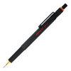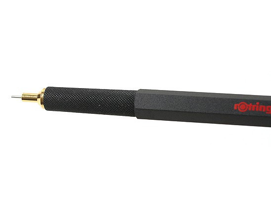 Rotring 800 Флагман серии механических карандашей с шестиугольным черным металлическим корпусом, кнопочным механизмом и текстурной металлической зоной захвата.