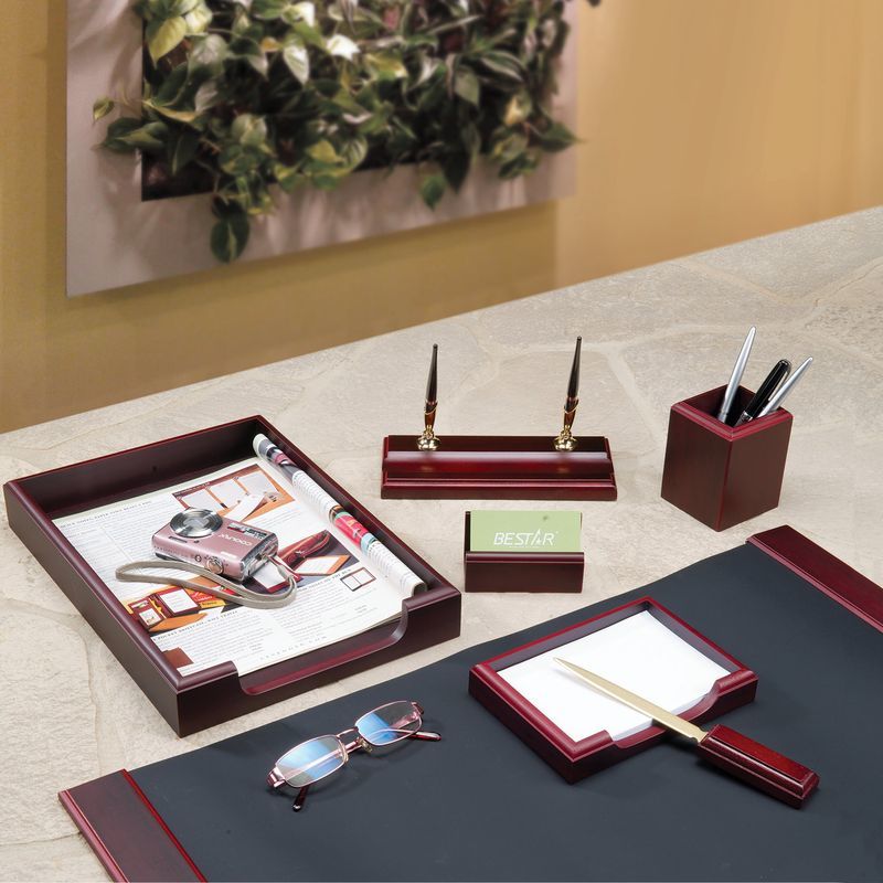 Настольный набор премиум-класса цвета "красное дерево" с золотистой фурнитурой состоит из 7 предметов и содержит самое необходимое для организации комфортного и элегантного рабочего места.